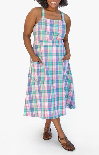 Greet sunny days in style in this plaid cotton-linen midi dress styled with square neck, crossback straps and side patch pockets.
