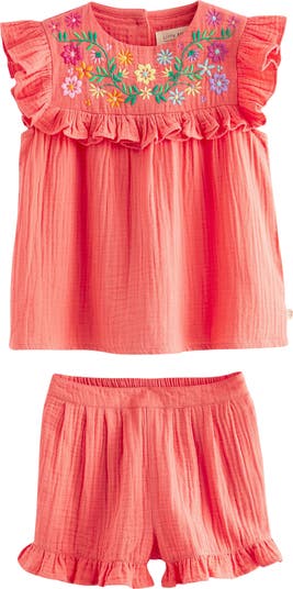 Lovely floral embroidery and frilly ruffles add sweet charm to this kids' set pairing a short-sleeve top with matching shorts made from textured cotton.