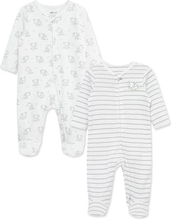 Baby will love the soft feeling of organic cotton on their skin when you refresh their wardrobe with this duo of footies complete with striped and darling elephant graphics.