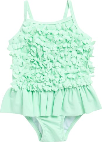Take baby out for a dip in this one-piece swimsuit featuring three-dimensional blooms and a frilly skirt.