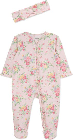 A matching headband keeps tresses at baby while baby sports this floral-patterned footie crafted from pure, breathable cotton.