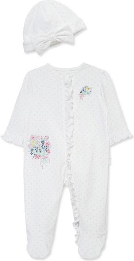 Baby will look cute and cuddly in this soft, stretchy footie that's instantly sweetened by a matching cap.