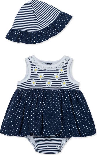 Easy snap closures allow for quick changes and easy diaper checks in a skirted bodysuit instantly sweetened by a matching hat.