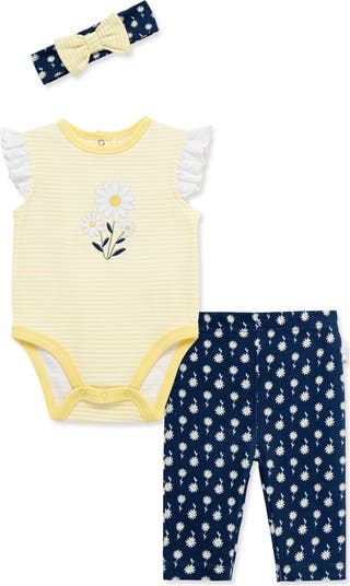 Baby will be ready to transition to a warmer season in this three-piece set patterned in springy daisy blooms and complete with a matching headband.