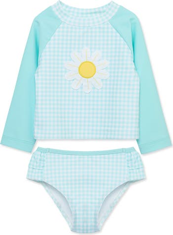 A protective rashguard top and coordinating bikini bottoms define a beach-day set sized for baby so they can splash and play in comfort and style.