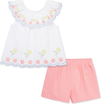 Baby will stay comfy and cute in this eyelet ruffle top and coordinating solid shorts set cut from pure cotton.