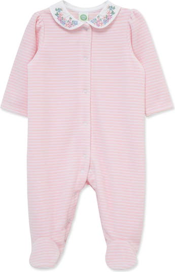 Treat baby to the cozy comfort of this plush velour footie tied up with a floral-embroidered collar for added charm.