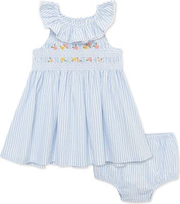 Give your baby an adorable look for playtime and sunny days with this striped smocked dress finished with frilly ruffles, allover smocking and floral embroidery and paired with matching bloomers.