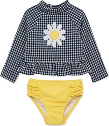 Bikini bottoms and a rashgaurd top made with UPF 50+ sun protection ensure baby's days spent on the beach are always a success.