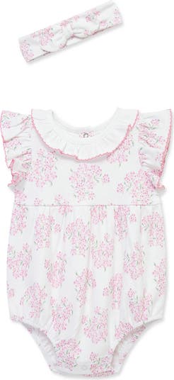 Frilly and fun, this bubble romper and coordinating headband set covered in a hydrangea motif is perfect for a picture-ready day.
