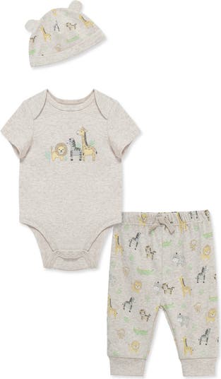 Give your little one jungle-inspired style with this adorable bodysuit, pants and hat set cut from soft, breathable cotton for maximum comfort.