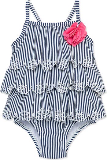 Scalloped tiers, ruffles and an embroidered trim details sweeten this one-piece swimsuit baby will love to splash around in.