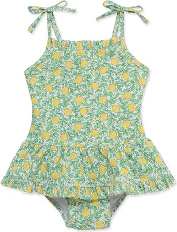 Tied straps and smocked details lend on-trend appeal to a one-piece swimsuit made with built-in sun protection.