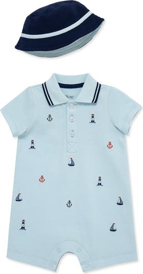 Dress baby for sunny family fun with this comfy cotton romper covered in nautical embroidery and complete with a matching hat.