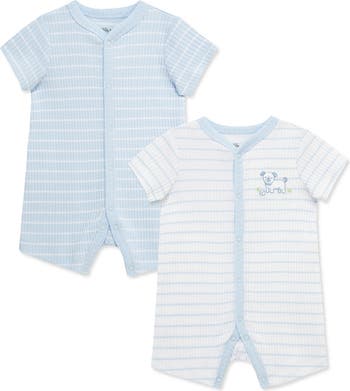 Organic-cotton fabrication ensures baby stays comfy and cozy in this duo of footies defined by classic stripes and an adorable puppy graphic.