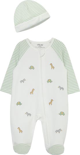 Whimsical animal embroidery and striped raglan sleeves up the charm of this soft cotton footie and hat set made just for baby.