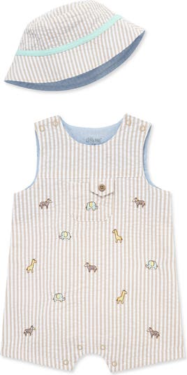 Have baby ready for zoo trips or playtime in this breathable pure‑cotton romper covered in animal motifs and paired with a coordinating bucket hat.