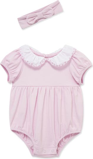 A scalloped collar lends a dose of sweetness to a bodysuit that comes with a matching headband to make it a perfect choice for special moments.