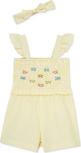Embroidered posies center the smocked bodice of a sunny-striped cotton romper that features ruffled straps and a bow-accented headband.