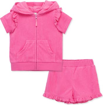 Baby will be ready for their next sunny day with this ruffled cover-up set that includes a short-sleeve zip-up hoodie and matching shorts.