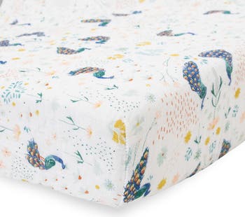 A playfully printed fitted crib sheet made of lightweight and breathable cotton muslin feels soft against baby's skin and is made in an open weave that dries quickly.