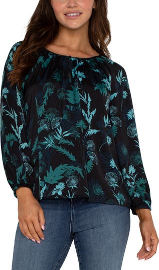 A meadow-at-midnight print covers a long-sleeve top fashioned with gentle shirring at the neck to create a breezy look.