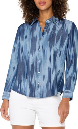An artful ikat pattern adds stunning style to this classic, curved-hem button-up shirt made from flowy woven fabric.