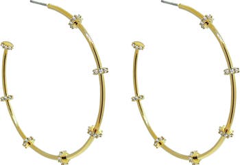 Cubic zirconia stations bring elegant sparkle to slender hoop earrings finished in 18-karat gold or silvertone plate.