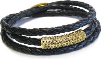 A polished charm encrusted with cubic zirconia adds contrasting detail to a triple-wrap bracelet shaped from braided leather.