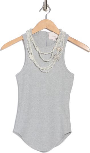 This easy ribbed tank does the accessorizing for you with necklace-like strands of faux pearls and crystal brooches.