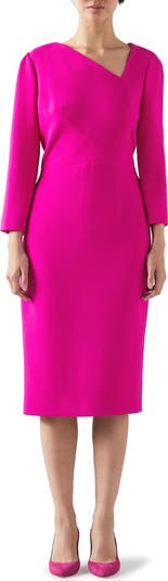This full-of-sophistication sheath is designed in an orchid hue with a sleek asymmetric neckline.