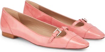 A slim top strap with gleaming buckle hardware bring day-or-night versatility to a demure flat styled with a squared-off toe and a modest heel.