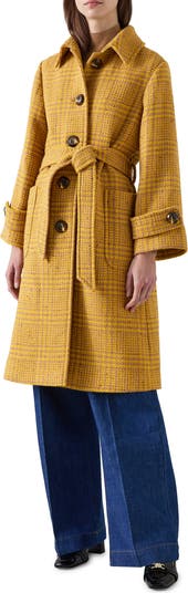 A sunny shade and a jazzy check brighten a cold-weather coat cut from pure wool with a touch of shape-retaining stretch.