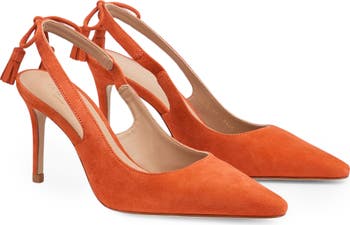 Swingy tassels and a delicate bow accent the slingback strap on a pointy-toe pump shaped from supple suede and set on a svelte stiletto heel.