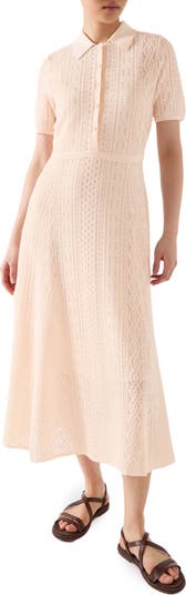 Shirtdress style is sweetened with a blushing hue and a lacy fabrication. Pearly buttons complete the darling aesthetic.
