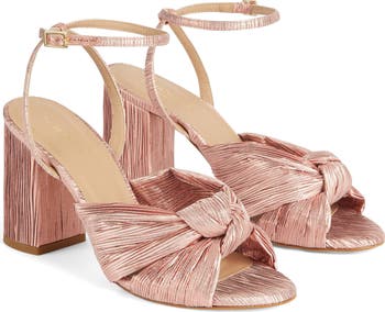 Gorgeous plissé fabric with a slight sheen elevates this block-heel sandal boasting twisted straps and sleek goldtone hardware.
