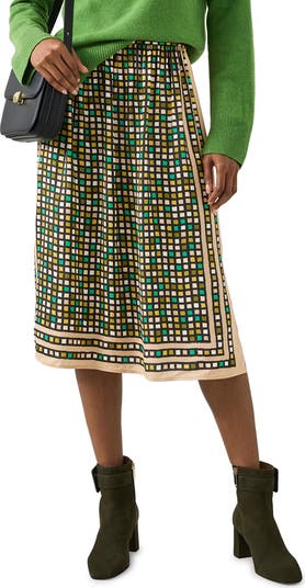 A scarf-inspired geometric print imbues this drapey A-line skirt with retro charm, while handy pockets and an elastic-back waist make it a practical essential.