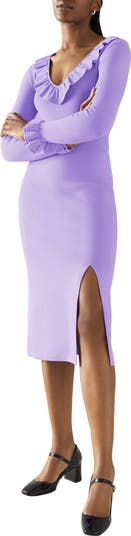 Flirty frills outline the V-neckline and cuffs of this stretchy rib-knit dress styled with a front slit.