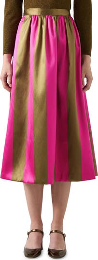 Bold stripes add joyful style to a swishy skirt cut from glossy satin and ready for outings both fun and fancy.