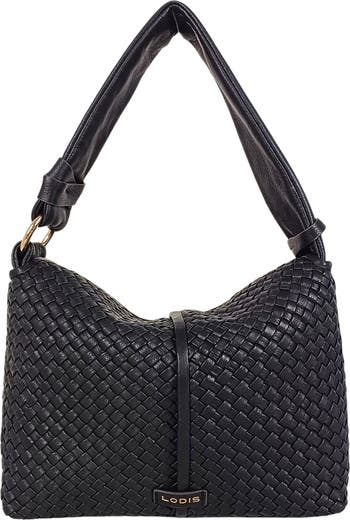 Gleaming logo hardware and smooth leather highlight the woven exterior of a voluminous shoulder bag featuring ample compartments for organizing your essentials.