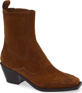 Intricate topstitching and scrolling overlays underscore the Western vibe of this suede Chelsea boot that's easy to put on and easier to love.
