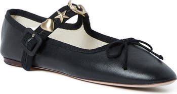 Mixed stud embellishments decorate the adjustable mary jane strap on a leather ballet flat finished with a charming instep bow and grosgrain topline.
