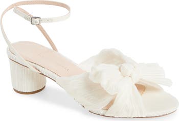 An airy textured fabric delivers vintage-inspired charm to a sandal with a blocky column heel and a soft bow at the toe.