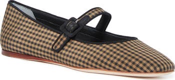 Woven raffia delivers an earthy flourish to a square-toe flat topped with a mary-jane strap.