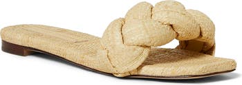Woven raffia delivers an earthy flourish to a summery slide sandal with a puffy braid at the toe.