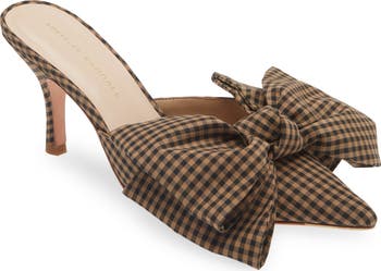 A voluminous bow and classic gingham pattern add visual intrigue to a luxe mule fashioned with a pointy toe.