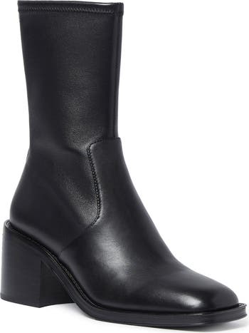 A squared-off toe and extended block heel balance a rich leather bootie fashioned with a side zipper for easy entry.