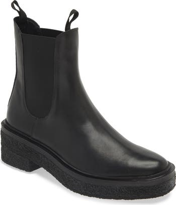 A crepe-rubber platform sole offers shock-absorbing comfort and enhanced traction for this versatile Chelsea boot created from smooth leather.