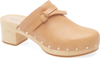 A knotted accent details the side of this Italian-leather clog lofted by a wood grain sole and detailed with round studs.