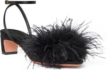 A wispy feathered strap adds voluminous dimension to this velvet sandal secured by a svelte ankle strap.